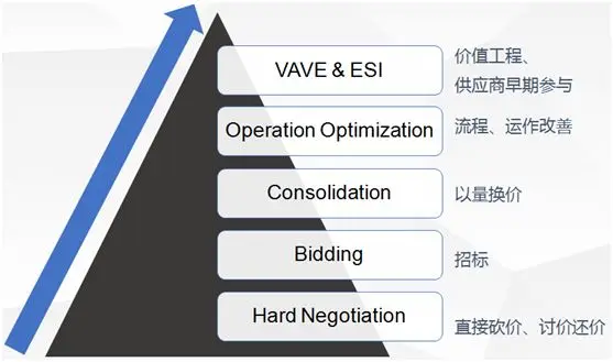 VAVE指的是价值分析和价值工程,ESI指的是供应商早期参与。这是因为实践和研究表明70%以上的物料采购成本都是在设计过程就决定了,包括设计材料选取和设计功能的影响。这种方法具体的技术此处不谈,但是有一个大的注意事项就是要和供应商进行利益分享,否则没人愿意在这个方面做工作,因为和材料和功能相关的设计优化,周期长、成效慢,属于典型的前途光明,但是路径难走的方式。