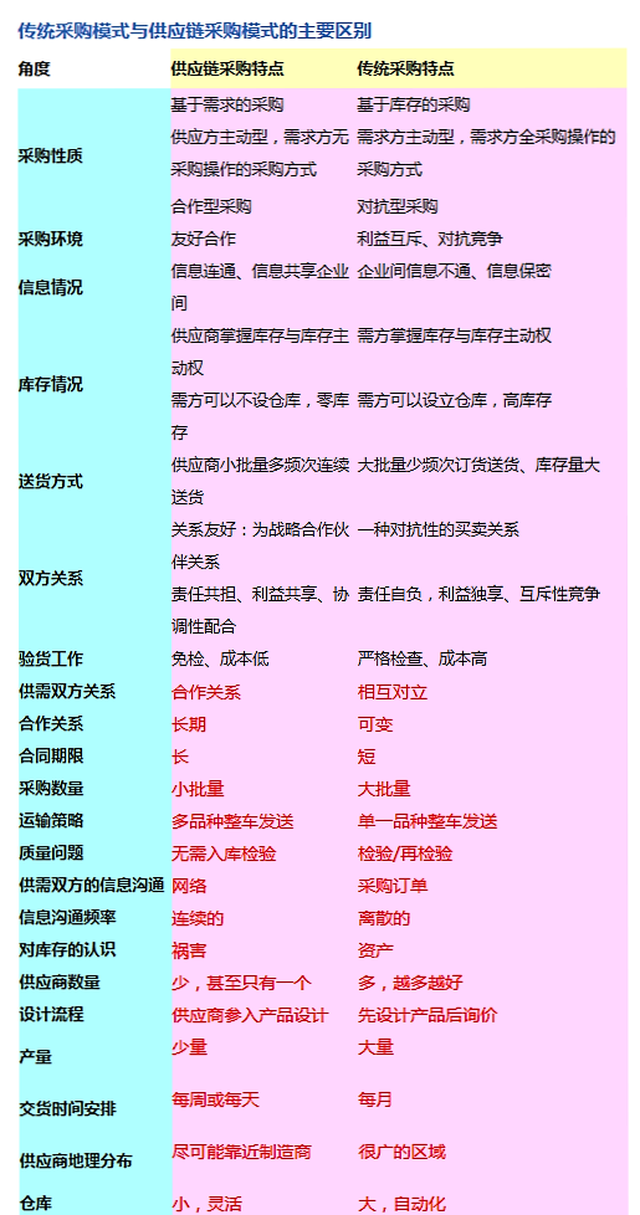 供应链采购与传统的采购相比,物资供需关系没变,采购的概念没变,但是,由于供应链各个企业之间是一种战略伙伴关系,采购是在一种非常友好合作的环境中进行,所以采购的观念和采购的操作都发生了很大变化。