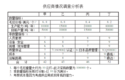 对于供应商的商业信誉情况,是向其主要客户进行咨询得到的。经过综合考虑,决定选择丙和丁作为谈判对象。