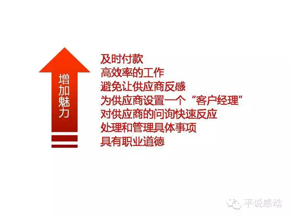 分析已经合作的供需关系,如果发现自己处在不利位置,也同样需要想办法提升自己的地位。提升地位的方法分为两个方向:提升自己对供应商的吸引力(媳妇儿太强势,就心甘情愿地做个好老公);另外一方面就是提升业务量(量的提升很难做到,就尽量集中采购,搭配采购等等)。下面2副图,可以形象表达出如何提升地位: