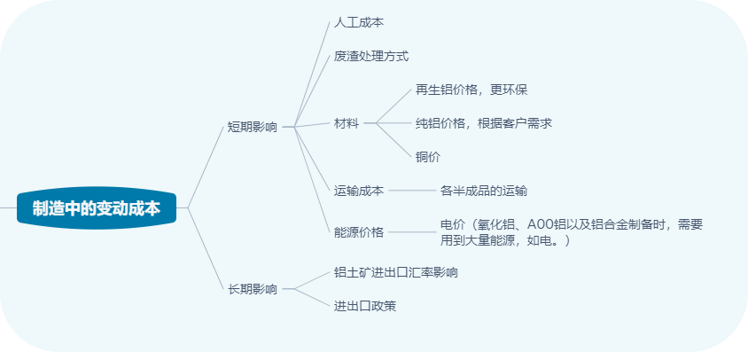 同样,我们分短期长期两个方面,来梳理铝合金产业的制造中,变动成本对价格的影响: