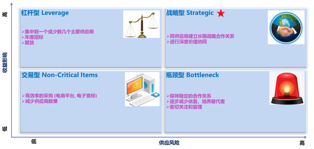 不择手段 对于战略型物料,该公司也采取了招标采购的方式。这样做弄不好就会影响供应商关系,也是不可取的。从下面的卡拉杰克模型展示中可以发现,杠杆型和部分交易型物料最适合采用招标方式,这样既有一定的采购金额,又能保证有足够的竞争参与者。