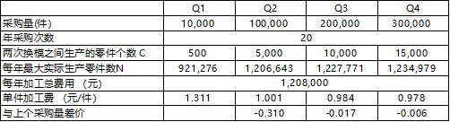 求:假设年采购次数均为20次,那么在采购量1万、10万、20万和30万的时候,产品单价件加工费用为多少?