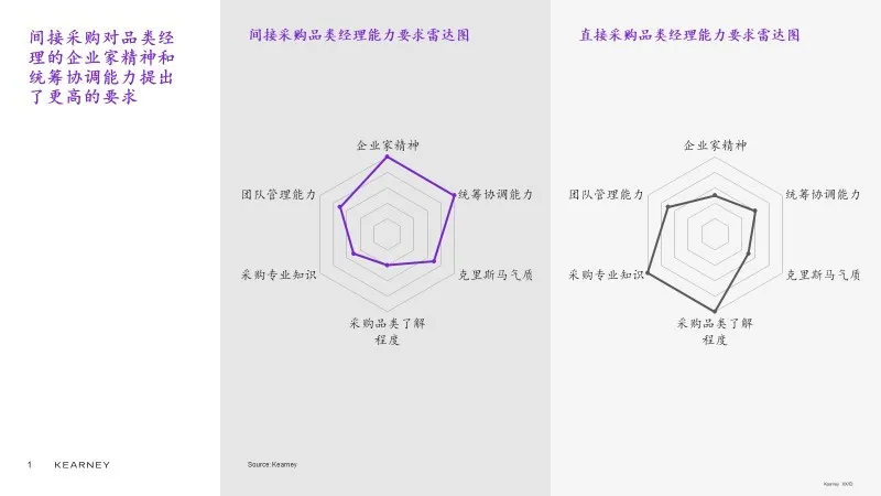 从采购部门内部来看,现有的直接采购品类管理人才并不一定能够胜任间接采购的重任。直接采购与间接采购对品类管理人才的能力需求侧重点是不同的。直接采购品类管理更倾向于“专家模式”,要求品类经理对所采购品类特性、供应商图谱、采购流程等拥有深入的了解。相较于直接采购对于品类管理专业知识深度的要求,间接采购的要求更倾向于“领袖模式”,强调自驱力和良好的跨部门协调沟通能力,对于品类管理、供应商管理的专业知识要求更追求广度而非深度。