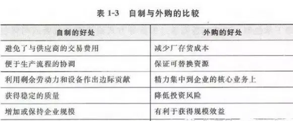 这项决策首先要同企业的核心业务相适应,同企业的总体战略相适应;还要受产品技术水平、工艺水平、生产能力、开发能力、投资能力、与供应商关系等诸多因素的影响。 自制与外购的比较如表1-3所示。