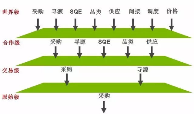 从原始级只有采购岗位,发展到交易级别的时候,出现了寻源岗位,专门负责供应商的寻找、选择、评估、品类规划等工作;进一步发展到合作级时,又细化出了负责供应商质量管理工作的SQE岗位,负责长期品类战略管理的岗位,负责中短期物资供应管理的岗位;达到世界级的时候,又增加了负责跨区域物料调度与协调的岗位,负责采购价格策略与跟踪的岗位,以及专门负责间接物料采购的岗位或部门。