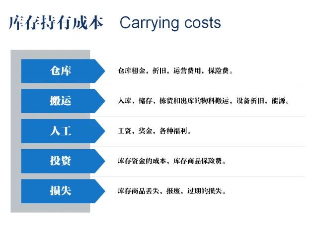这里面主要包括以下这些费用,在计算的时候是取持有成本占库存成本的百分比。在不同的行业之间,这个百分比有一些差异。