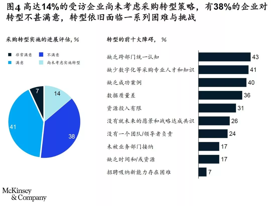 根据过去24个月与几十位在华企业首席采购官(CPO)的对话,我们了解到,仍有高达14%的受访企业尚未考虑采购转型策略,有38%的CPO对组织内采购转型的现状不甚满意,其主要挑战可以总结为:组织内对未来采购职能认知的不一致,企业缺少对技术、数据及分析的投入,以及明显的技能型人才缺口(见图4)。