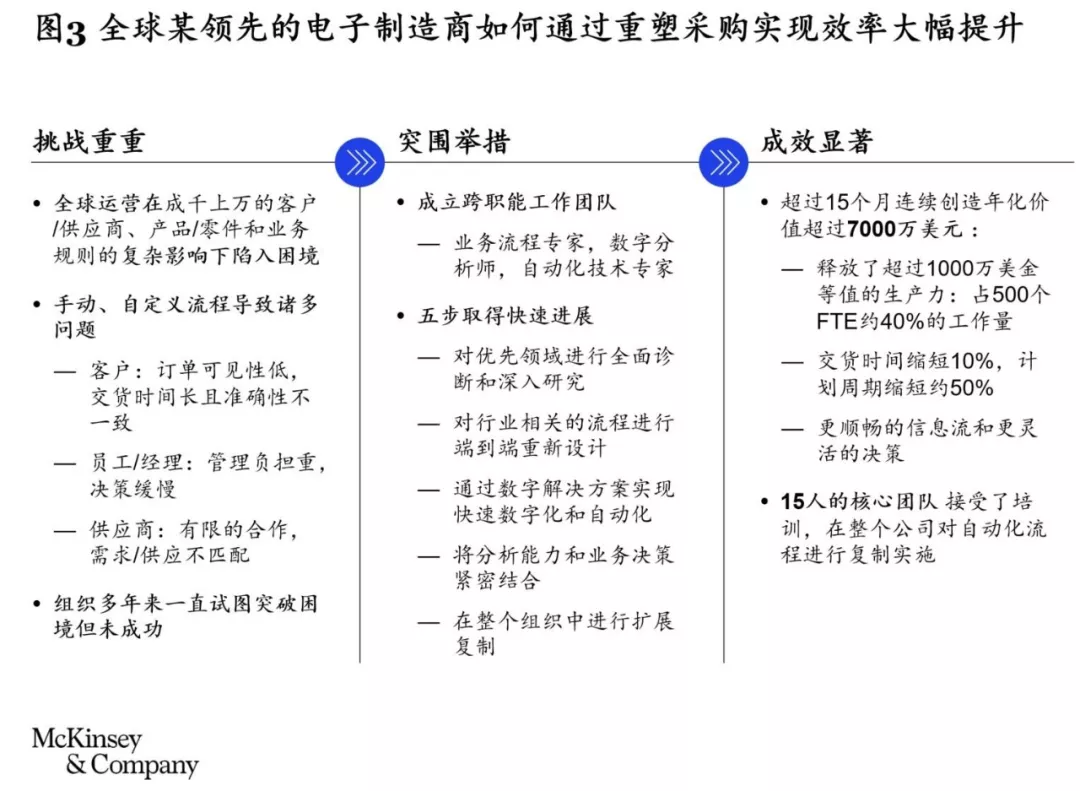 全球某领先的电子制造商通过对采购部门的自动化关键流程的重新设计和实施,实现了超过7000万美元的年化运营绩效提升,同时也使得信息流动更加顺畅,决策更加灵活。该公司还成立了15人的核心团队,在全公司大范围推广自动化流程(见图3)。
