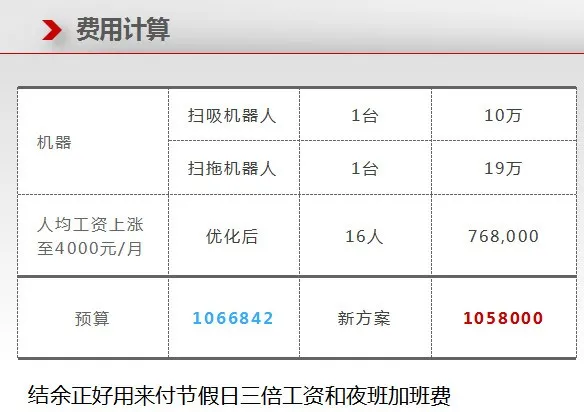 工资在上涨,预算涨幅如果小于工资涨幅,或者预算保持不变,甚至还有所下降, 要想达到规定的保洁效果,通常看来几乎是不可能的事情。但因为采用了机器人替代,不仅没超预算,保洁效果还有所提高,典型的通过创新取得成功的案例。