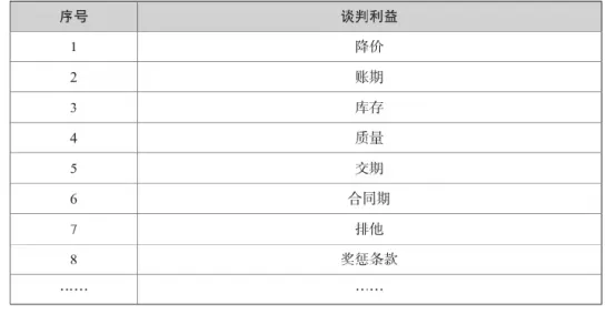 例如,在某场采购谈判中,双方的谈判利益次序表如下表所示。采购人员可以通过延长合同期限或增加标的物范围等方式,从时间和种类等维度增加采购额,从而增加供应商的销量,以换取更低的采购价格或让供应商同意自备一定的安全库存。采购人员还可以提出缩短账期,以换取供应商降价或备库。总之,只要是供应商想要获得的利益,就可以用来交换。