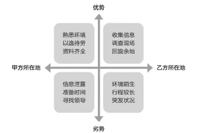对采购人员来说,在己方所在地谈判的劣势是:己方的信息有可能泄露;需要提前布置会场;当采购人员说自己没有足够的权限时,强势的供应商可能会要求直接与采购人员的领导谈判。
