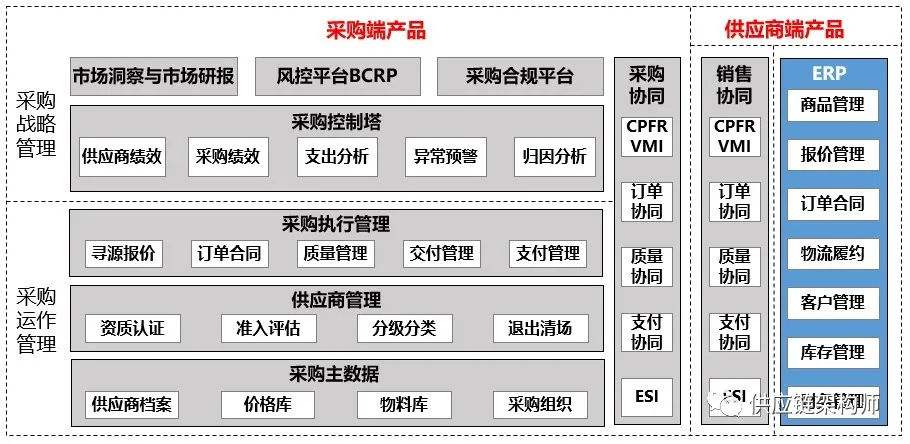 数字采购产品主要分为采购端和供应商端,基于SaaS化产品架构,有利于采供两端协同运作。采购端分为采购战略管理和采购运作管理两层。供应商端产品主要功能为销售协同,该模块与供应商的ERP产品打通,从而减少供应商端的操作成本。