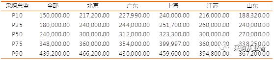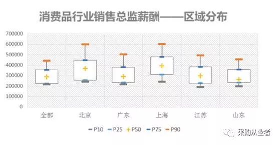 从区域分布来分析销售总监薪酬情况的话,北京和上海依旧是领跑全国,而这次的情况和采购总监不同:北京的薪酬虽然90分位较高,但是整体比较紧凑,说明付薪差异相对较小。而上海的付薪差异则均匀,并且大于北京的付薪差异。