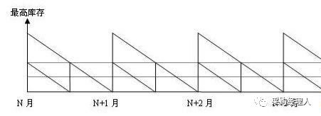 假设企业对一种物料的需求是均匀的、不变的,物料的采购提前期是一个月,不考虑安全库存和物料交付的意外情况,企业的库存水平及消耗曲线如下: