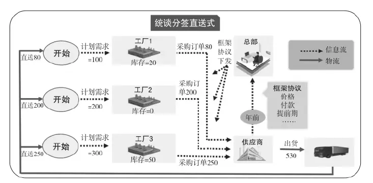 它与统谈统签配送式的区别在于,供应商直接给各分厂送货,而不是通过中转仓库,因此更加便捷,如图4所示。