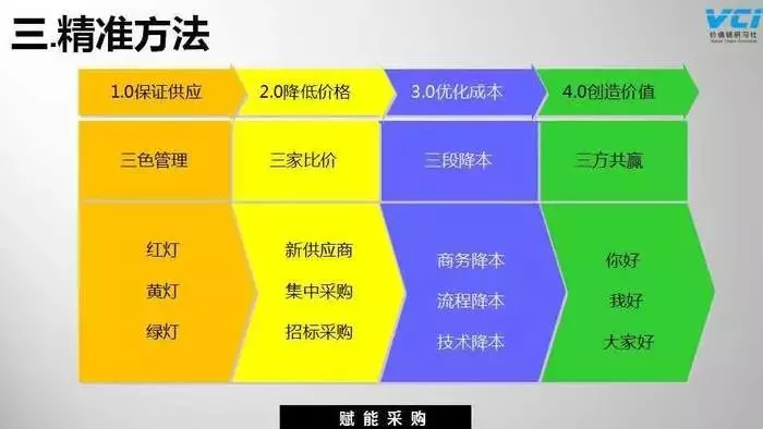 3.0阶段供应商降价已经行不通了,这个时候我们考虑如何降低采购总成本,甚至是供应商的成本,来实现经济效益。重点是成本!