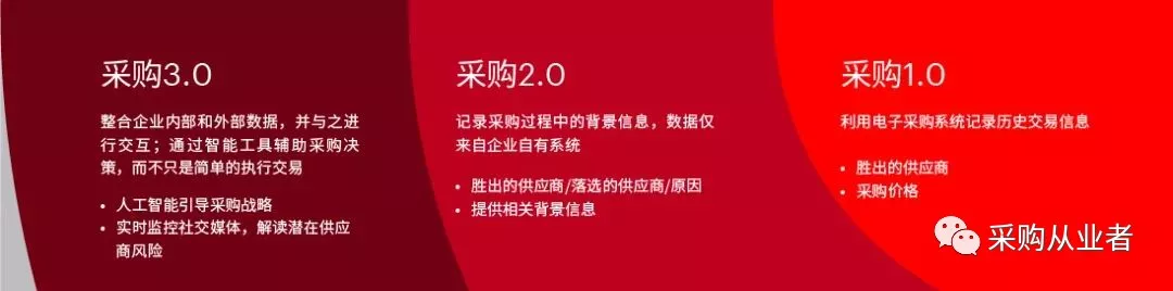 数字化采购并不是简单的IT技术升级,而是要告别采购部门沿用几十年的运营模式,帮助企业从采购1.0阶段向采购2.0转变,并在之后2-4年,迈向采购3.0时代。
