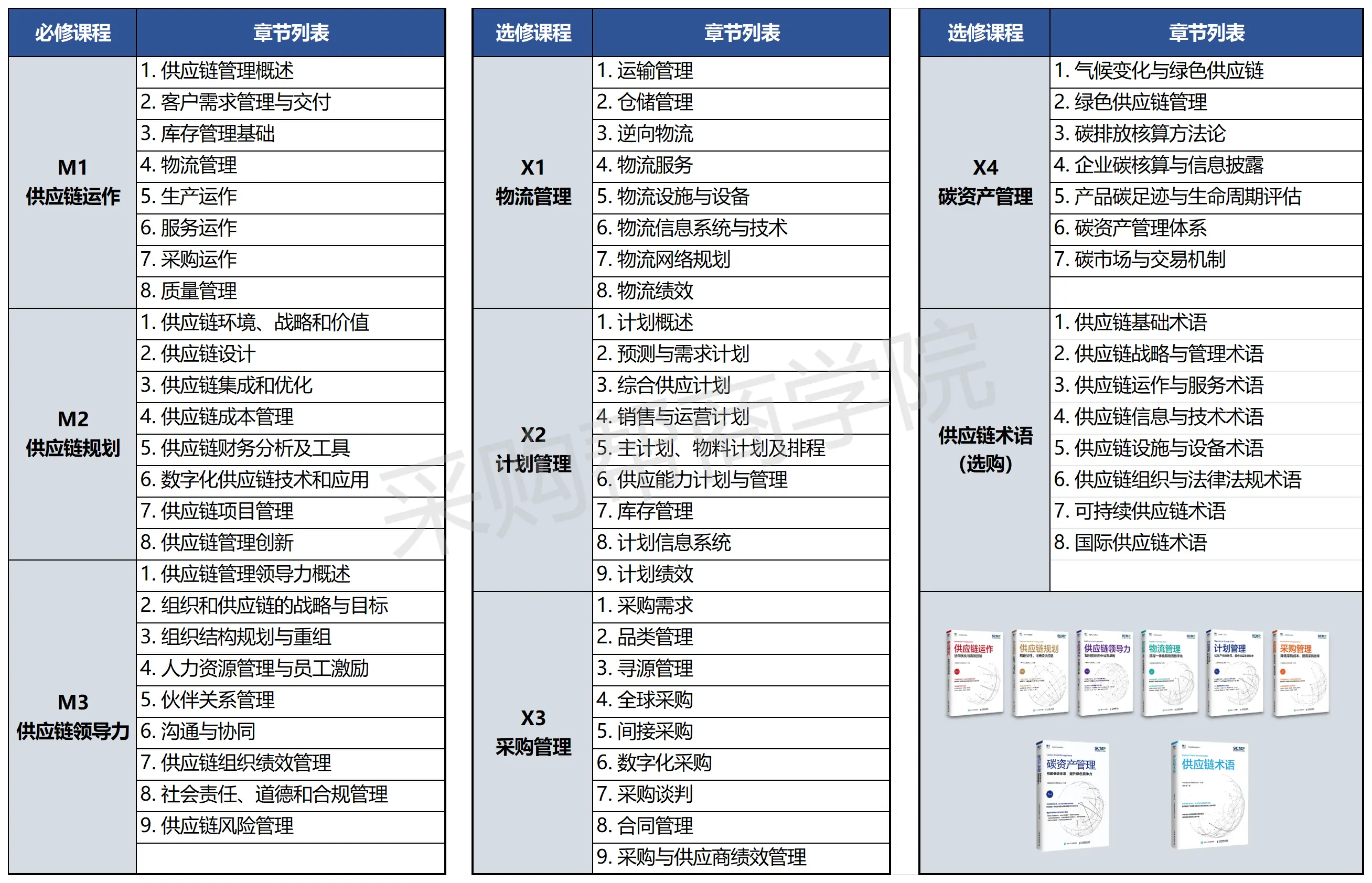 “供应链管理专家(SCMP)”知识体系自2024年起将采用“3(三门必修课)+X(自选一门选修课)”的认证思路。SCMP 认证大体分为三个环节: 培训-考试-认证。