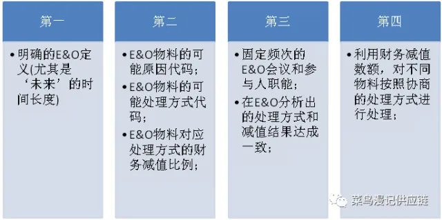 对于E&O,我们要秉承着为成功想办法,而不是为困难找借口的哲学,杜绝从根本上避免E&O的认识,对现有和持续会有的E&O,首先建立和完善流程、接着充分协作,借助研发、销售、财务等职能力量,不断降低E&O,释放财务和仓库空间,让库存结构改善,储备当前真正需要的货物。